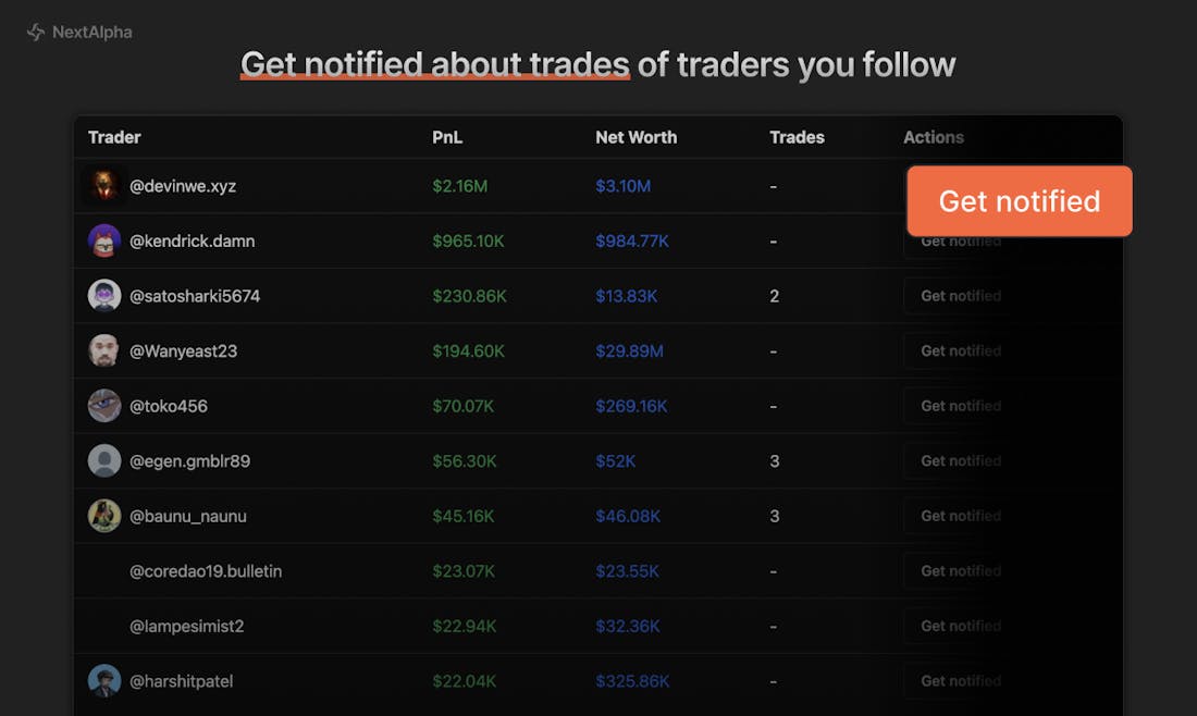Một trong những tính năng nổi bật của Next Alpha là khả năng theo dõi và sao chép giao dịch từ những trader hàng đầu. Người dùng có thể dễ dàng tìm kiếm danh sách các trader có hiệu suất giao dịch tốt nhất và nhận thông báo khi họ thực hiện giao dịch mới.